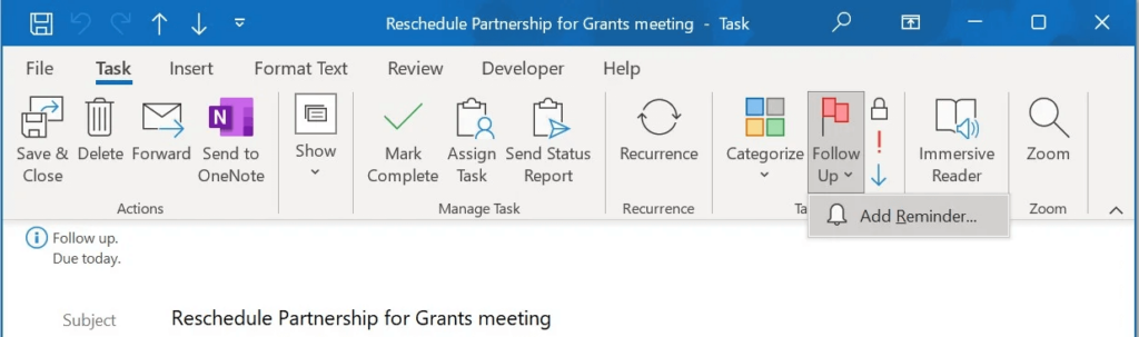 - Choose Reminder from the Follow Up dropdown in the Tags group.