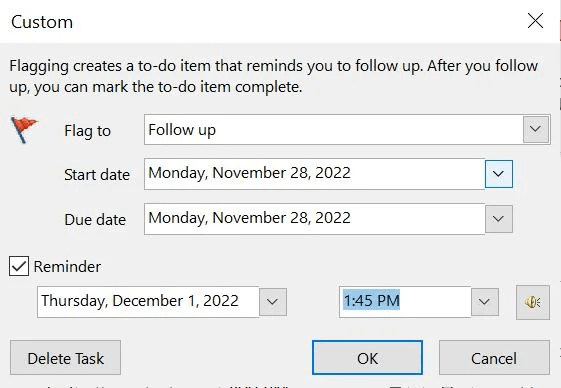 Set a reminder time in Outlook.