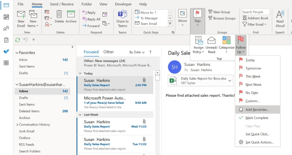Select Add Reminder from the Follow Up option in the Tags dropdown in Outlook.