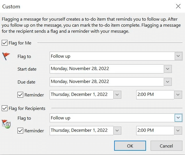 You can set a reminder for yourself and the email’s recipient in Outlook.
