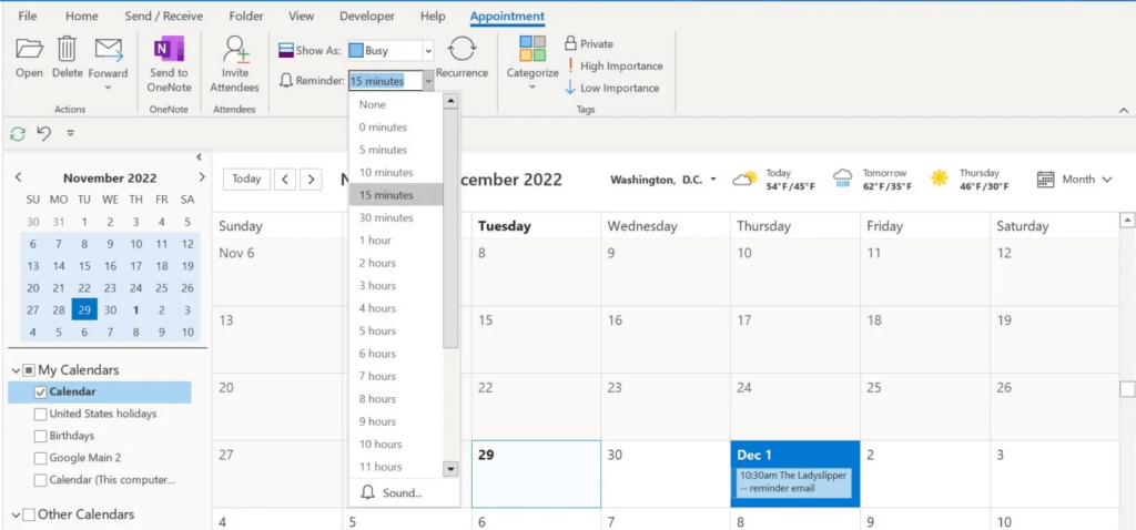 When setting a reminder for an appointment, you set an interval time, such as 18 hours or 15 minutes. Choose from this setting’s dropdown (Figure G). Alternatively, you can enter the reminder interval from the keyboard.