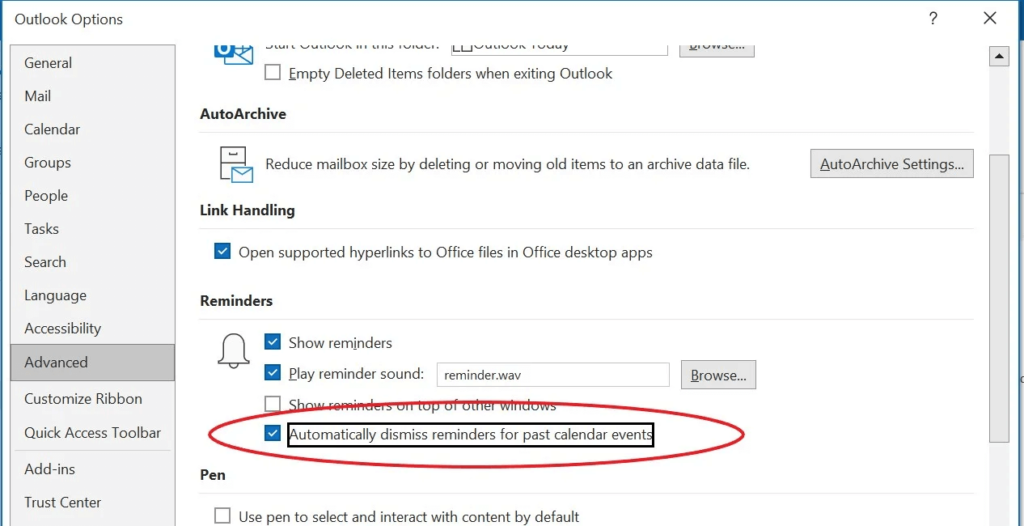 Check this option to remove all reminders for past events in Outlook.