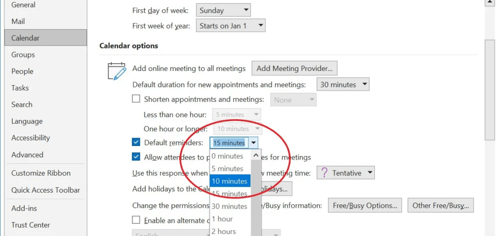 In the Calendar Options section, look for Default Reminders. Click the dropdown, and choose 10 minutes (Figure J).
